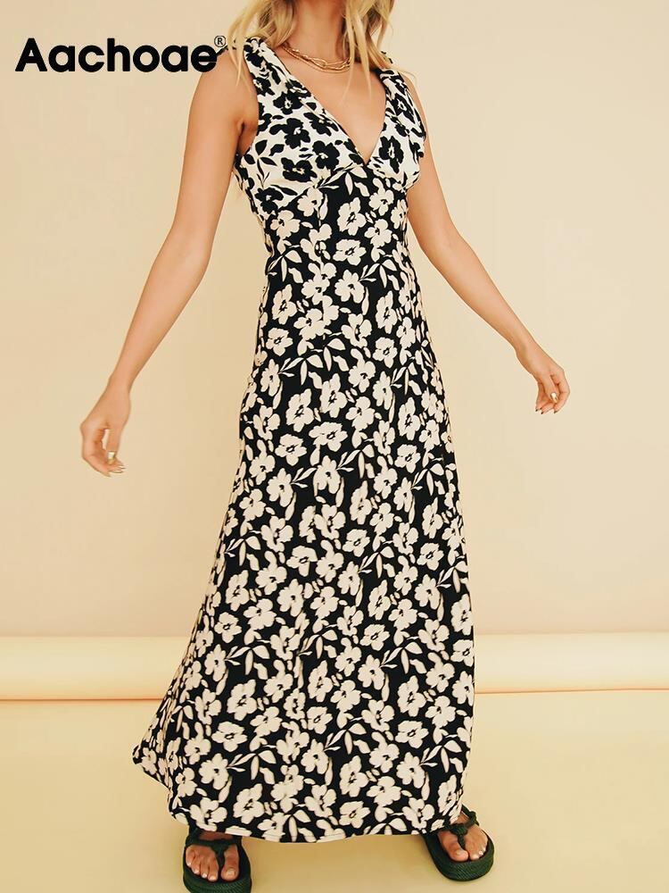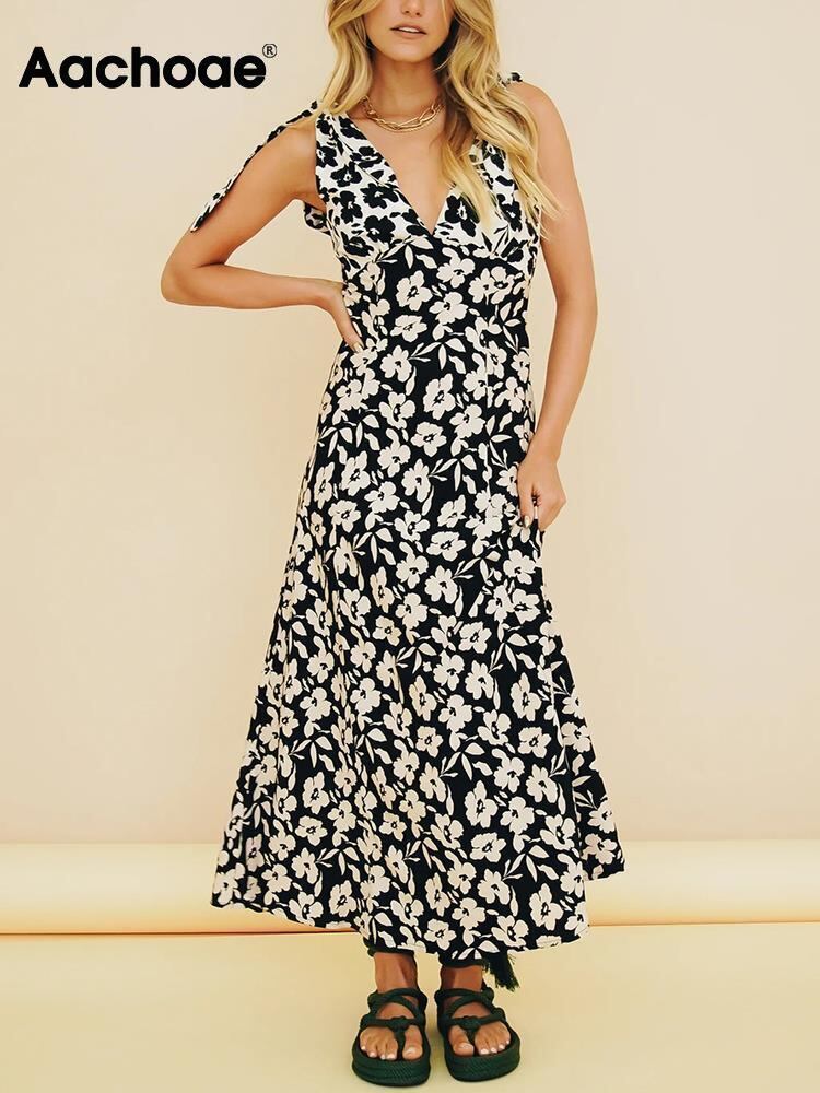Aachoae 女性花柄ノースリーブ ロング ドレス セクシーな V ネック弓スパゲッティ ストラップ ドレス A ライン ドレス リボン Vネック Aライン aac37793154817 | city&trip