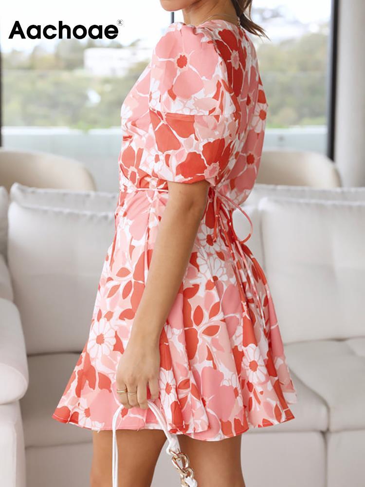 Aachoae 夏の女性の花柄プリントミニドレス V ネックパフ半袖 A ラインドレススリムドレス ショート ハーフスリーブ サマー 夏物 Vネック Aライン aac88626576606 | city&trip