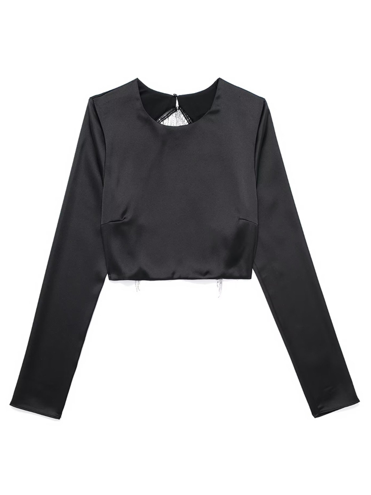Aachoae 女性のセクシーな無地ブラウストップス O ネック長袖クロップドトップスシックなスパンコールバックカットアウトブラウス ロング Oネック ソリッドカラー aac16777323970 | city&trip