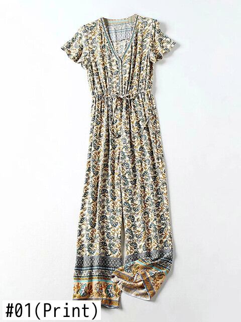 Aachoae 花柄 V ネックジャンプスーツ女性の夏の半袖蝶ネクタイ弾性ウエストジャンプスーツワイドレッグオーバーオール ショート リボン ハーフスリーブ エラスティック 伸縮 サマー 夏物 Vネック ワイドパンツ aac9160068858 | city&trip