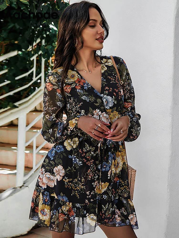 Aachoae レトロ花柄シフォンミニドレス女性 V ネックフリルパーティードレス A ライン長袖ボヘミアンドレス ロング ラッフル Vネック Aライン aac82426626958 | city&trip