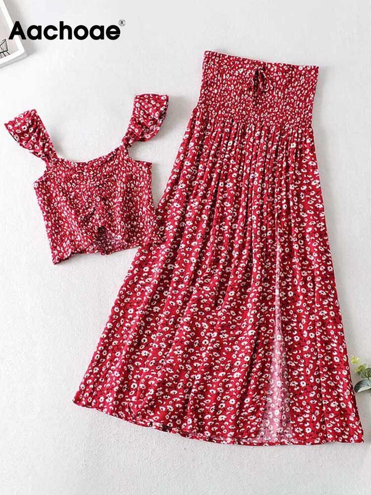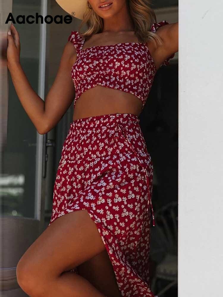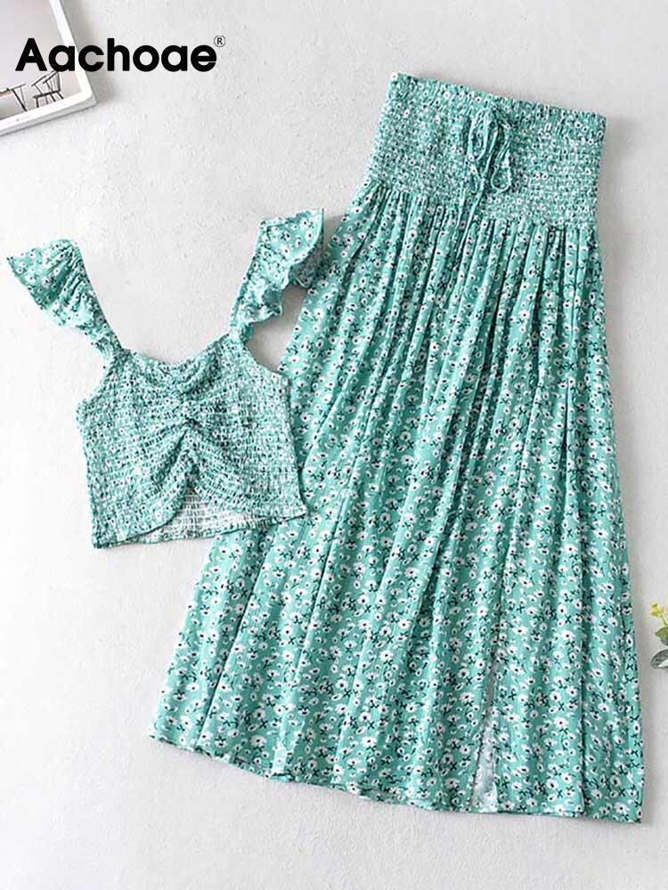 Aachoae 女性のビーチスタイルのツーピースセットトップとスカート夏花柄フリルトップススプリットロングスカート自由奔放に生きる 2 点セット ラッフル サマー 夏物 aac89727622025 | city&trip