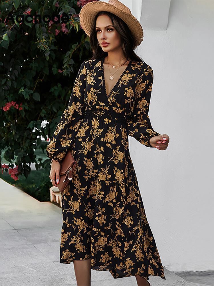 Aachoae 女性花柄ロングドレスレースパッチワークレディパーティードレス V ネックランタンスリーブ自由奔放に生きるビーチドレスローブ Vネック aac18204787263 | city&trip