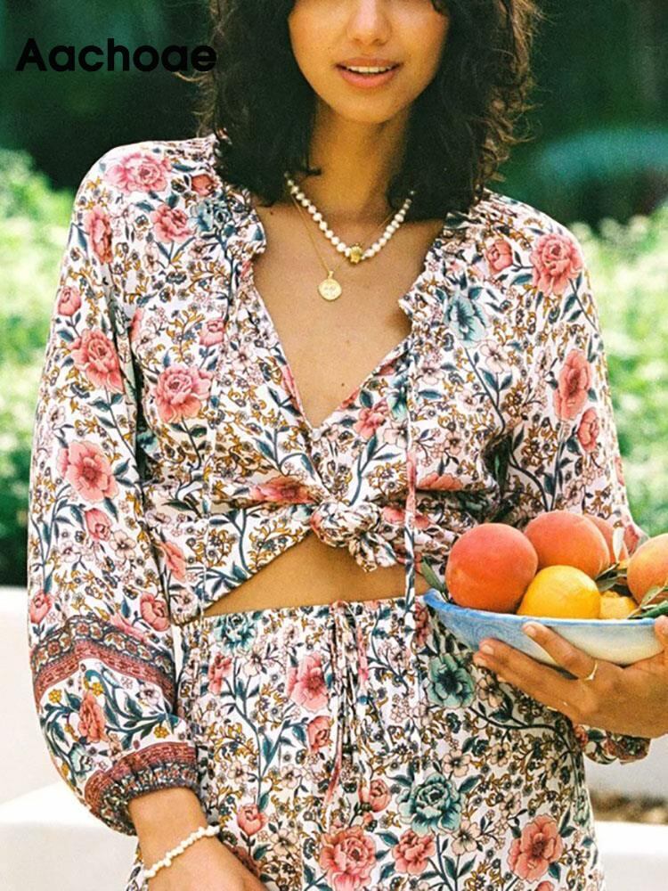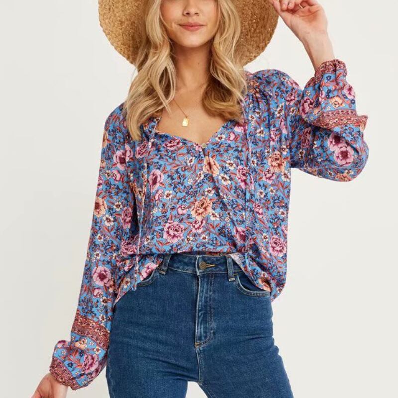 Aachoae ボヘミアン ブラウス シャツ女性弓ネック花柄シャツ ランタン長袖女性ビーチ トップス春夏 ロング リボン スプリング 春物 サマー 夏物 ビーチトップ aac88815575788 | city&trip