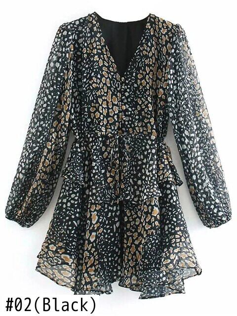 Aachoae 夏の女性のヒョウ柄ミニドレス蝶ネクタイランタンスリーブフリルシフォンドレスセクシーなシースルービーチドレス リボン ラッフル サマー 夏物 aac75876744265 | city&trip