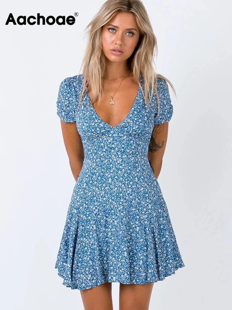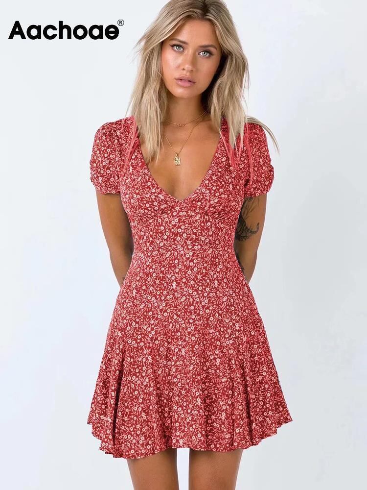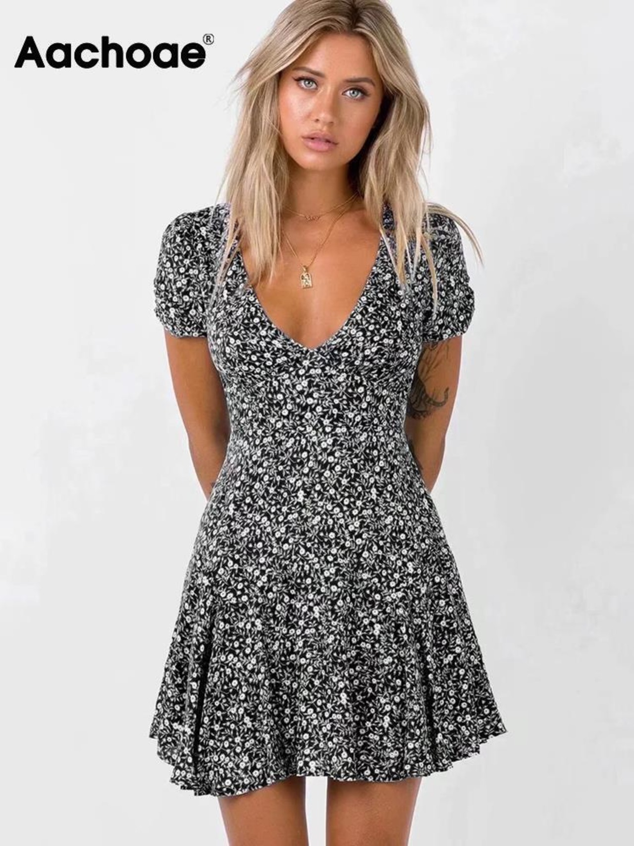 Aachoae レディース Aライン パーティードレス シックなVネック 半袖 花柄プリント ミニドレス ホリデーパーティードレス ショート ハーフスリーブ aac50142776017 | city&trip