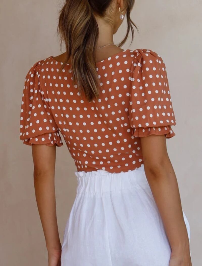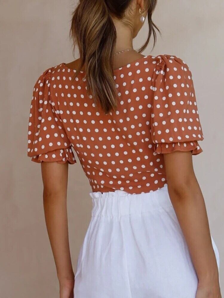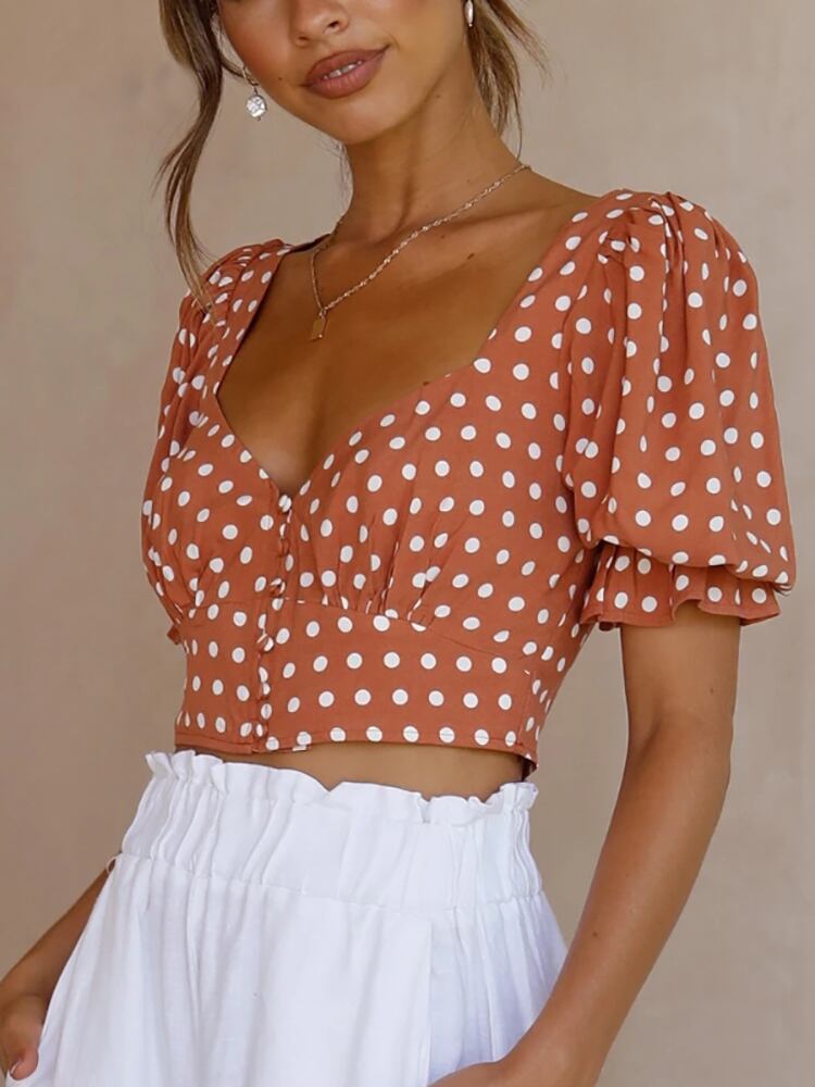 Aachoae 夏女性ポルカドットプリントクロップブラウスパフ半袖ボディコンシャツ V ネックスリムトップス ショート ハーフスリーブ サマー 夏物 Vネック aac30382403530 | city&trip