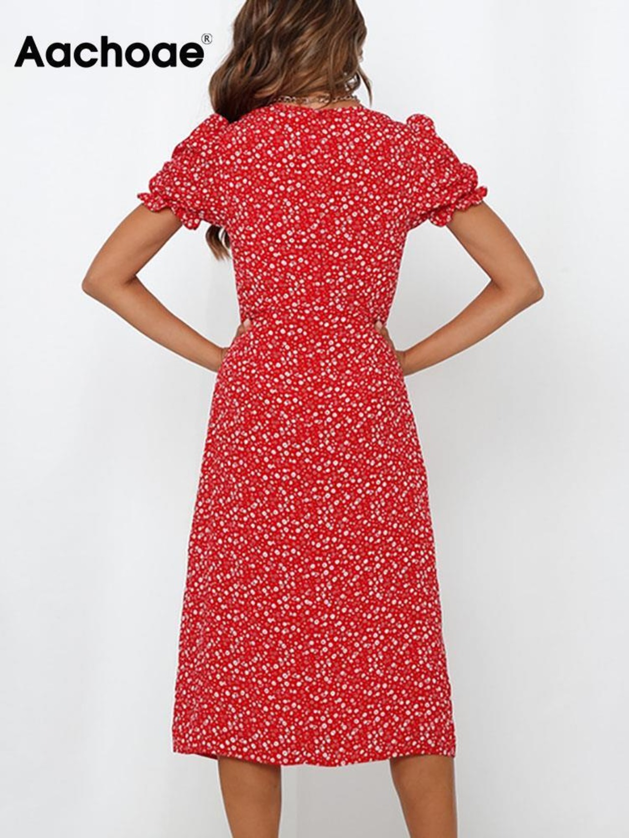 Aachoae フローラル プリント ドレス フロント スプリット パーティー ミディ ドレス バタフライ ショート スリーブ レッド ドレス A ライン サンドレス Vestido 半袖 ハーフスリーブ 花柄 Aライン aac53012193155 | city&trip