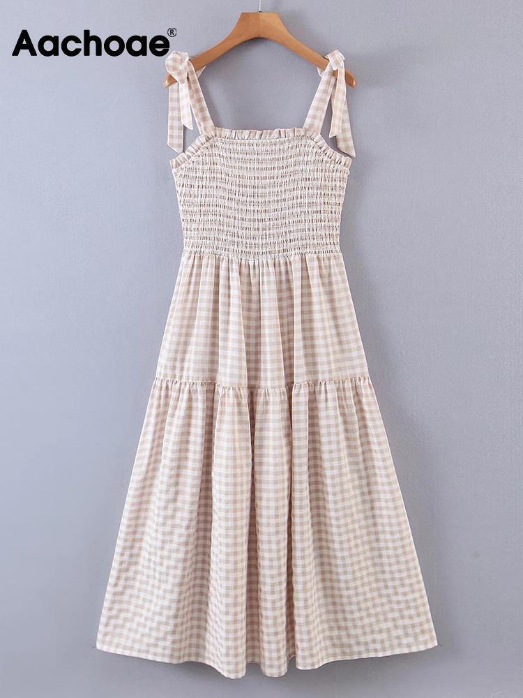 Aachoae チェック柄プリント ミディ ドレス スパゲッティ ストラップ A ライン ドレス女性の夏のパーティー ドレス ローブ サマー 夏物 Aライン aac57016909931 | city&trip