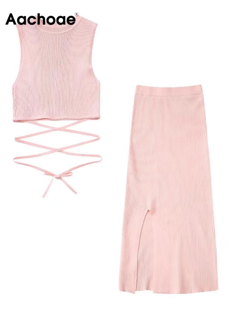 Aachoae 女性セット 無地 O ネック ノースリーブ バック レースアップ ニット タンクトップ ウエスト サイド スプリット スカート Oネック ソリッドカラー aac10748653962 | city&trip