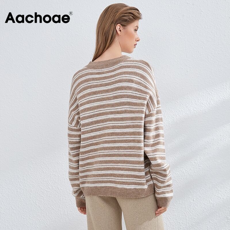 Aachoae 女性の基本的な O ネックバットウィング長袖ニットセーターシックなストライプジャンパー秋の女性ルーズセータートップス ロング オータム 秋物 Oネック aac54696966045 | city&trip