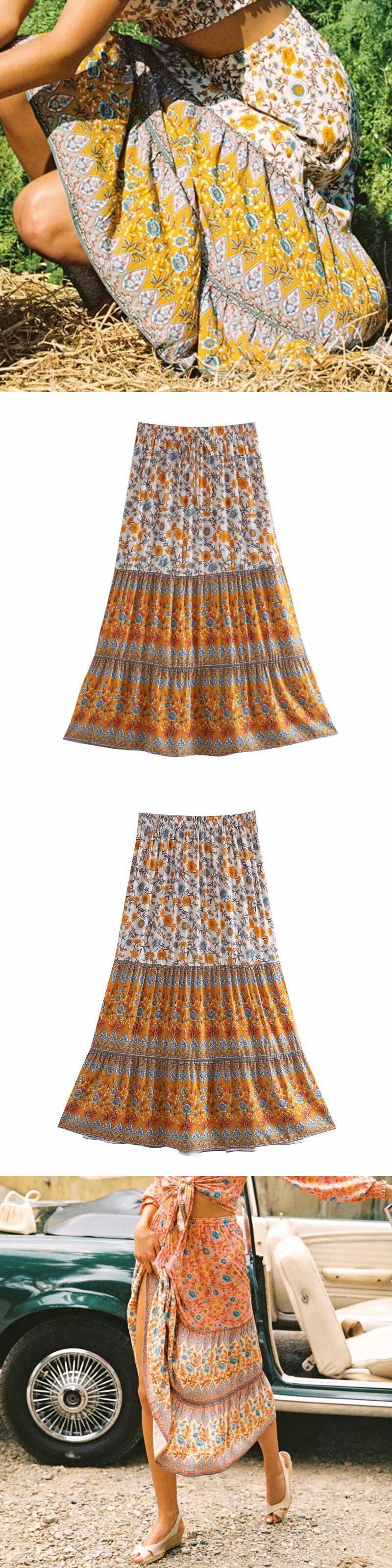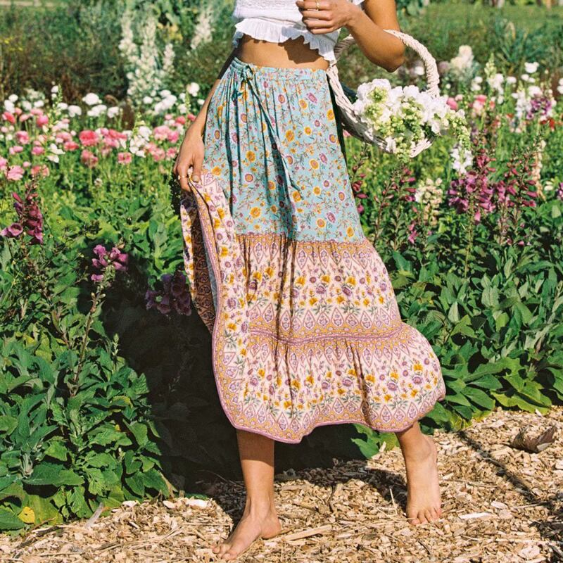 Aachoae ボヘミアン花柄ロングスカート春夏ウエスト蝶ネクタイビーチプリーツスカートゆったり女性ボトムスファルダ リボン スプリング 春物 サマー 夏物 aac30418974026 | city&trip