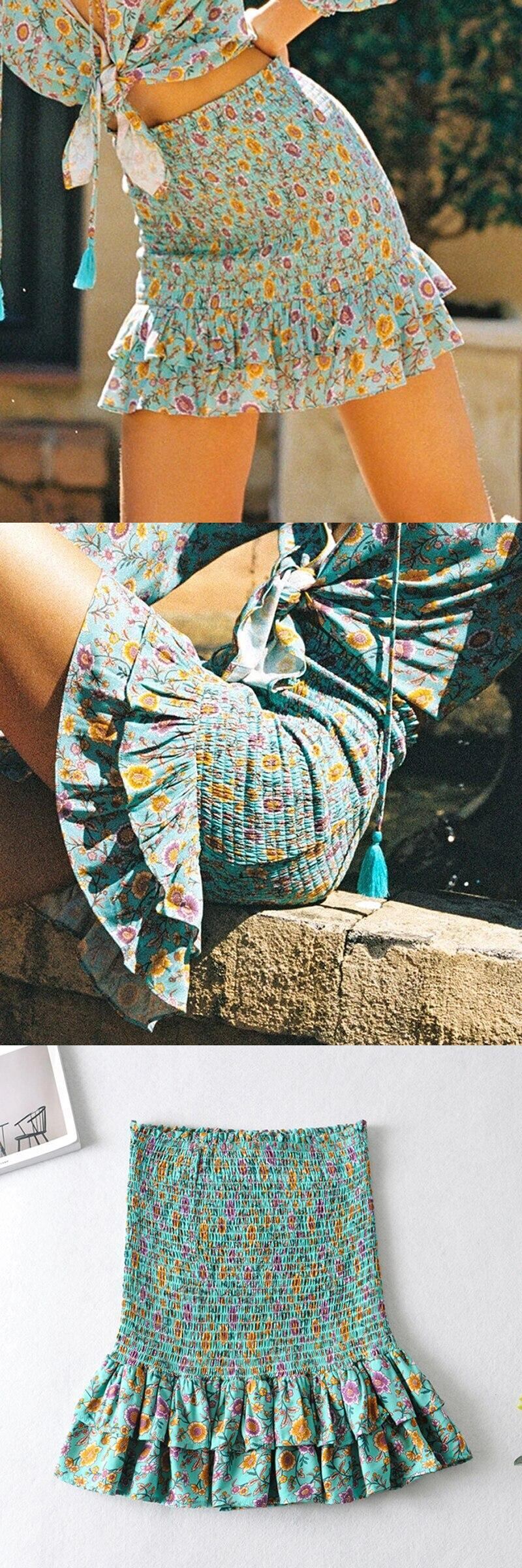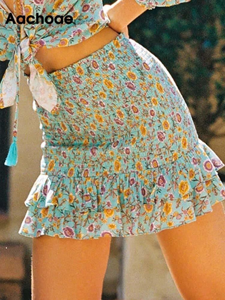 Aachoae 夏花柄ミニスカート女性弾性ヒップボディコンスカートフリルセクシーなビーチパーティースカート女性ボトムス段 Faldas ラッフル エラスティック 伸縮 サマー 夏物 aac19039015637 | city&trip