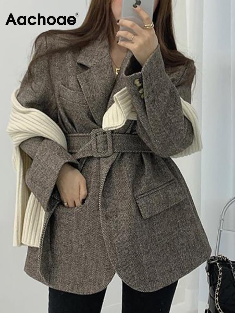 Aachoae 女性秋冬ウールコート付きベルトターンダウン襟長袖ポケット上着オフィスコート ロング オータム 秋物 ウィンター 冬物 ハーネス 会社 学校 通勤や通学にも aac93227749650 | city&trip