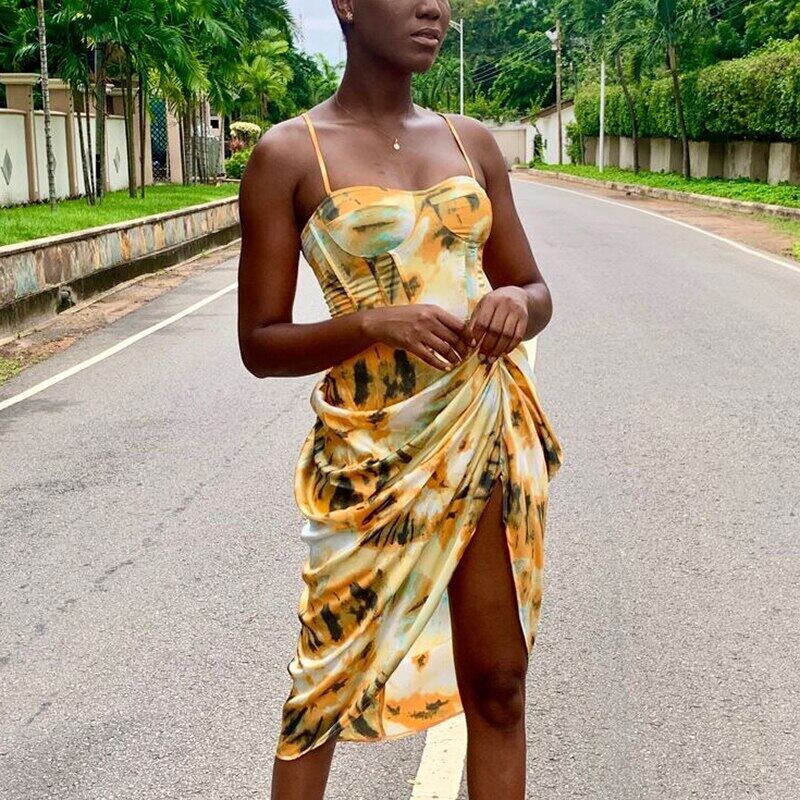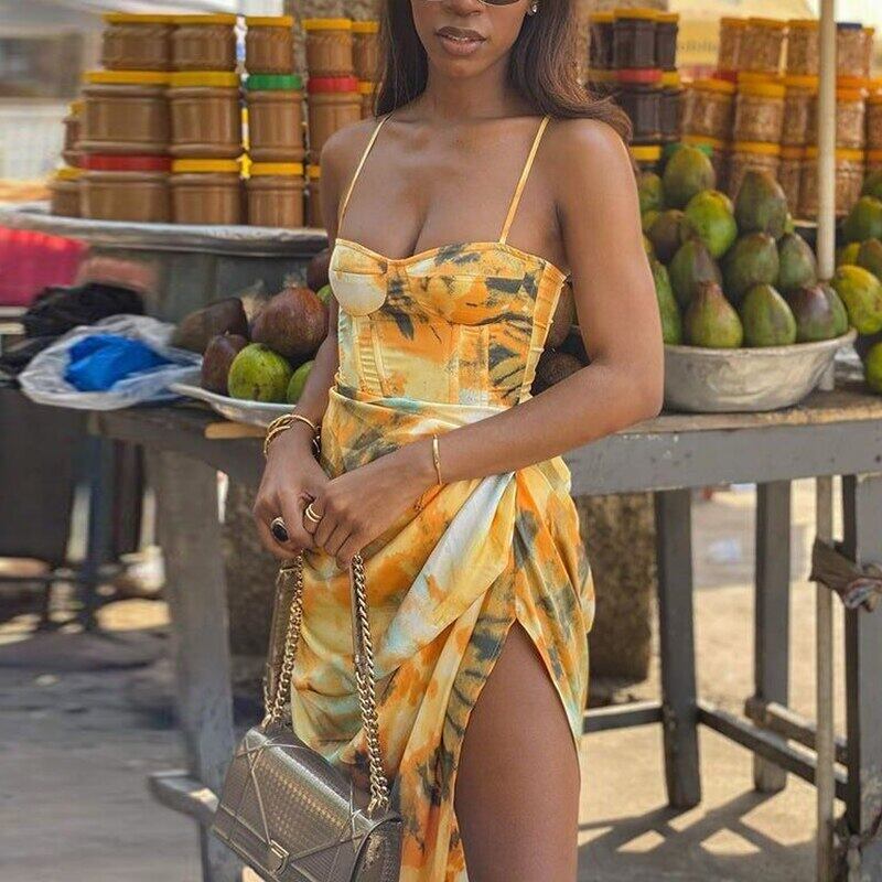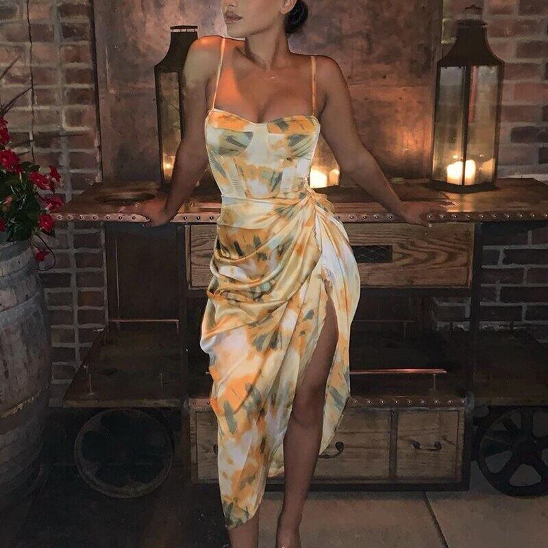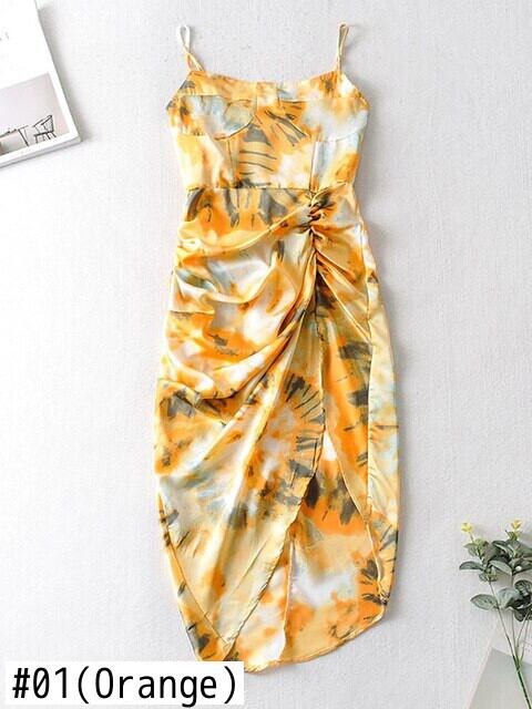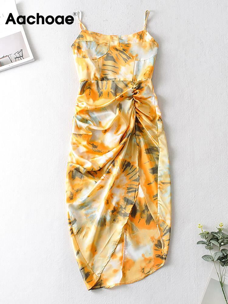Aachoae 夏スパゲッティストラップビーチドレス女性プリントスプリットセクシーなホリデードレスノースリーブバックレスプリーツサテンミディドレス サマー 夏物 aac56036516593 | city&trip