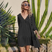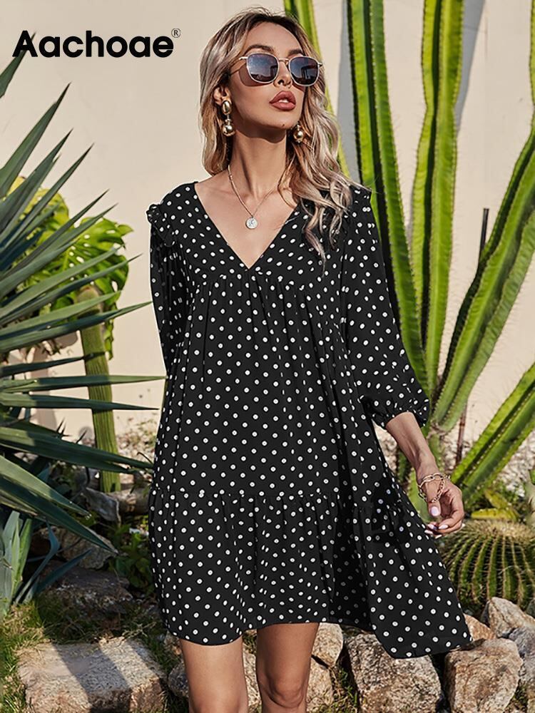 Aachoae 女性ルーズポルカドットドレス V ネックプリーツシフォンドレスランタンハーフスリーブミニビーチドレスサマーローブ 半袖 夏物 Vネック aac34152513483 | city&trip