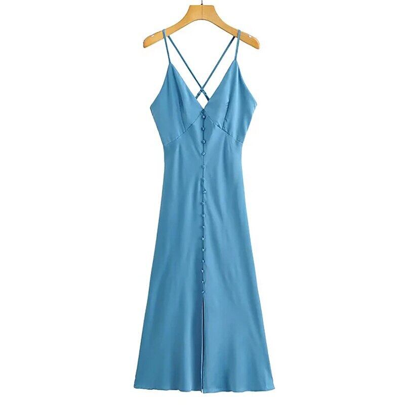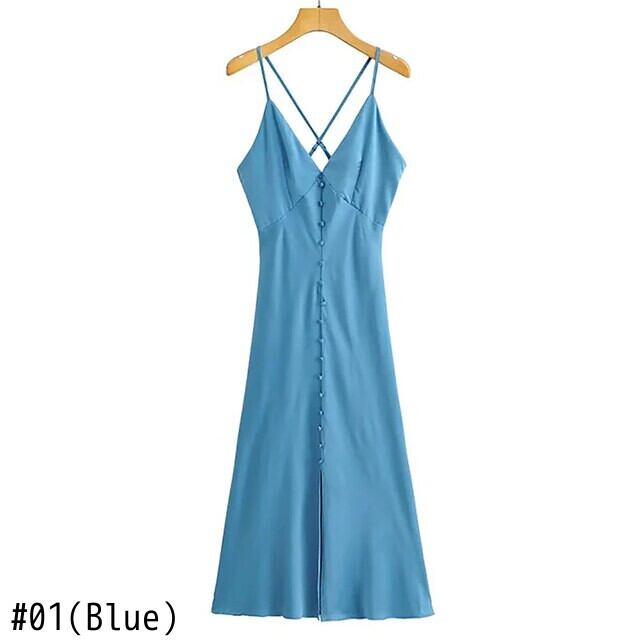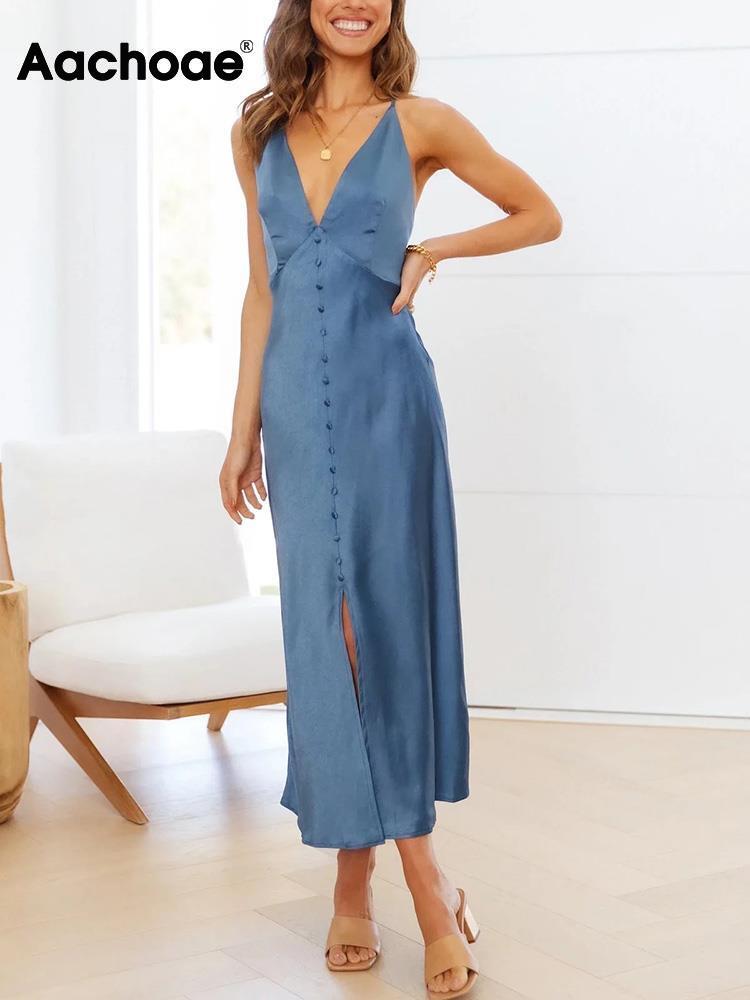Aachoae 女性のセクシーな深い V ネック無地ボタン ドレス スパゲッティ ストラップ フロント スプリット ドレス パーティー ドレス Vネック ソリッドカラー aac10613713107 | city&trip