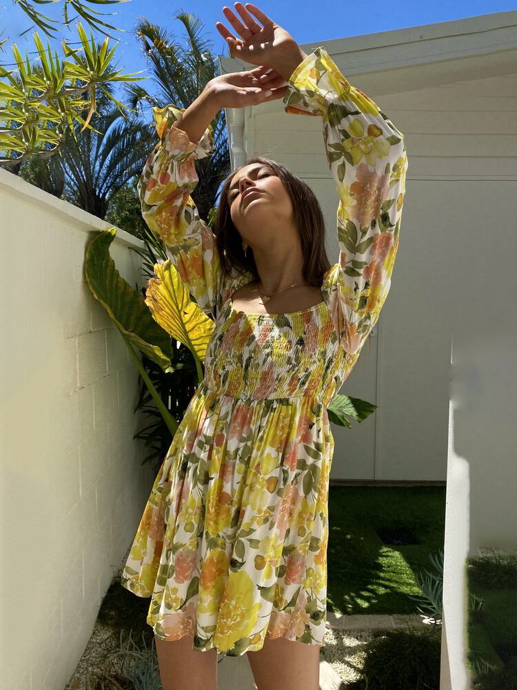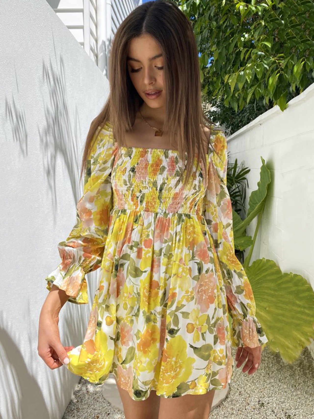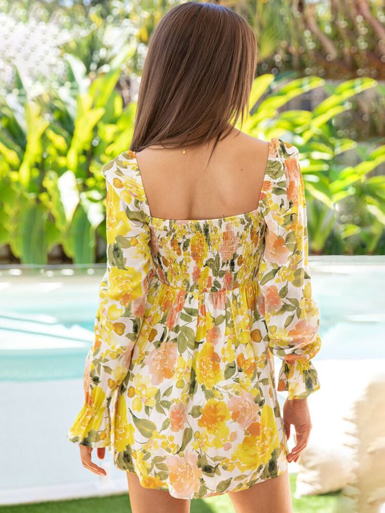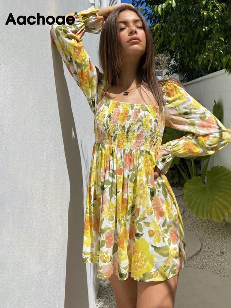 Aachoae レディース 花柄プリント ミニドレス スクエアカラー バタフライ ロングスリーブドレス ホリデードレス 春 長袖 スプリング 春物 スクウェア aac38416715812 | city&trip