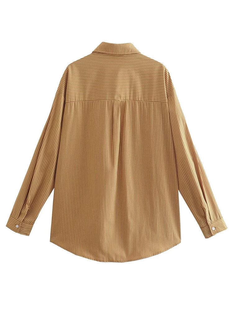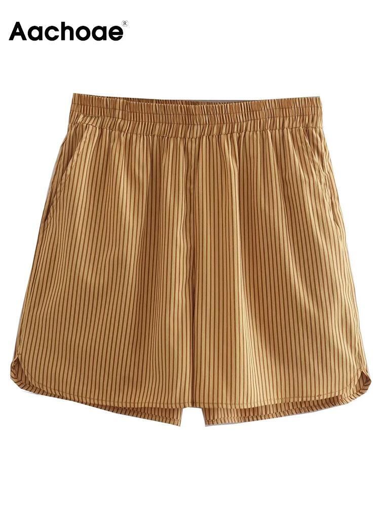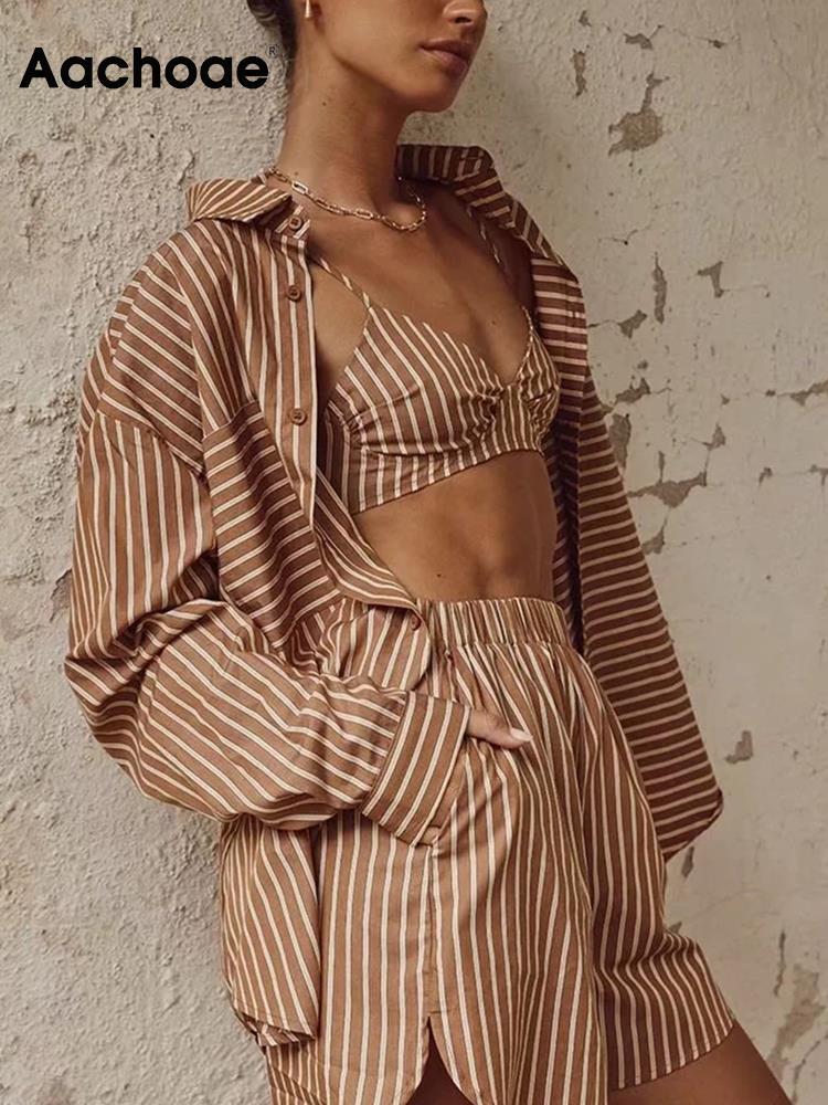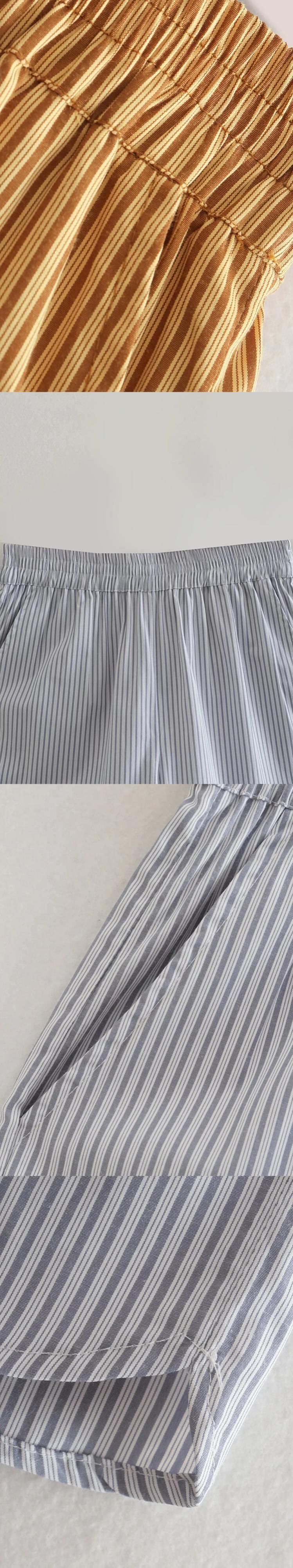 Aachoae レディース 2点セット ストライプ プリント 長袖 ボタンアップ ブラウス シャツ 伸縮性ウエストショーツ付き ロング エラスティック ブルマー aac65983930075 | city&trip