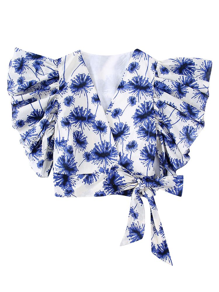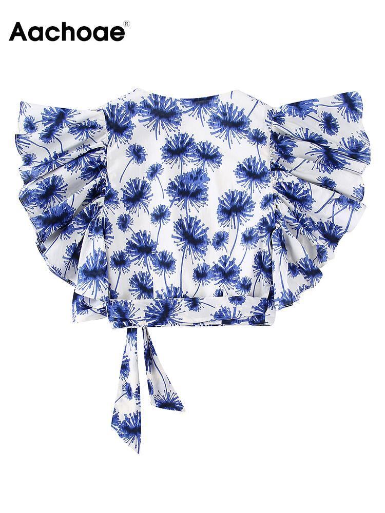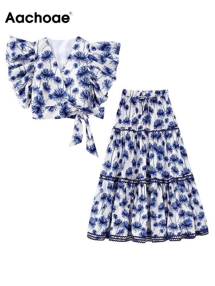 Aachoae 2 点セット花柄プリント V ネック半袖クロップド ブラウス シャツ ウエストゴム付き A ライン スカート ショート ハーフスリーブ エラスティック 伸縮 Vネック Aライン