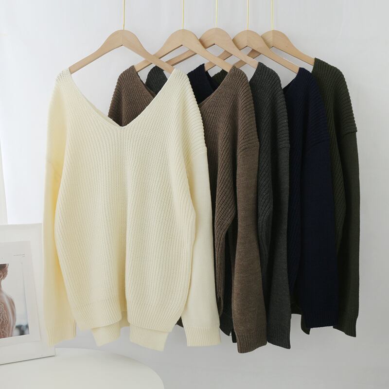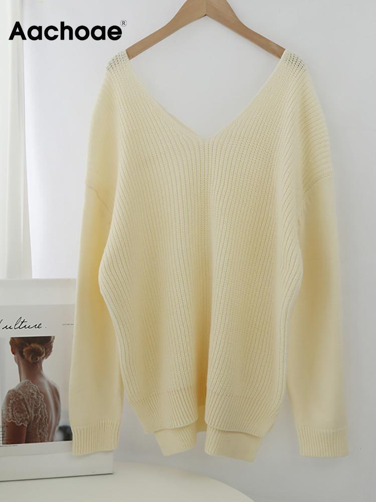 Aachoae V ネック プルオーバー セーター秋ソリッド ベーシック ジャンパー トップス バットウィング長袖ルーズ セーター ロング オータム 秋物 Vネック ソリッドカラー | city&trip