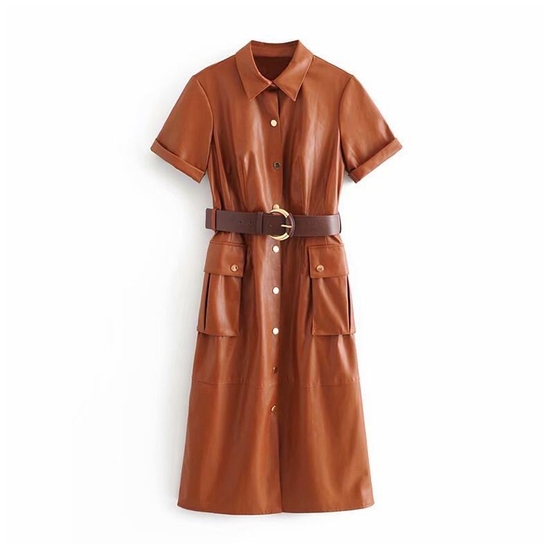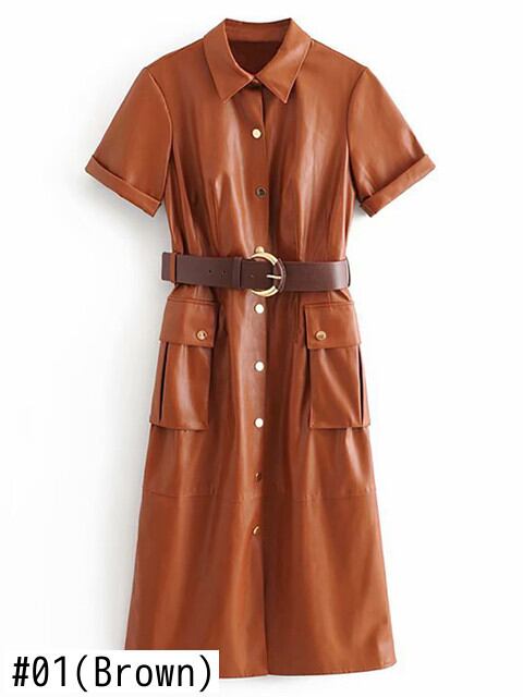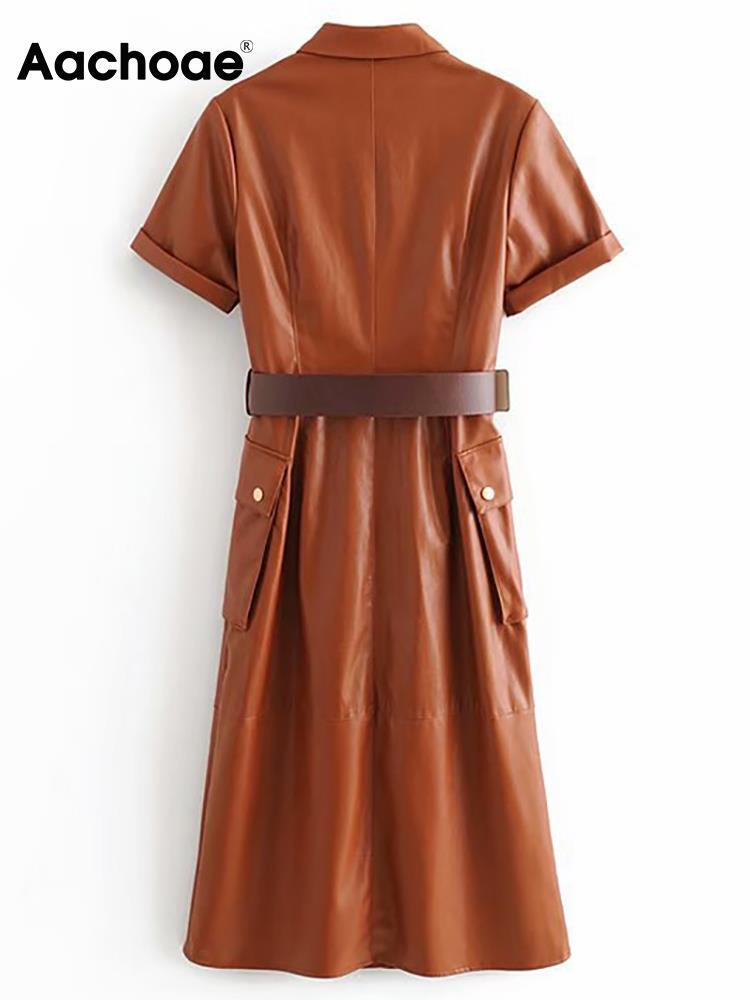 Aachoae Pu レザーミディドレス半袖ストリートストレートドレスとベルトターンダウン襟オフィスウェアドレス ショート ハーフスリーブ ハーネス ソリッドカラー 会社 学校 通勤や通学にも | city&trip