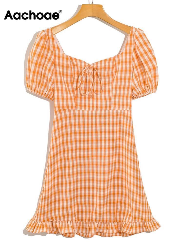 Aachoae スウィートチェック柄プリントフリル A ラインドレススクエアカラーパフ半袖ミニドレスパーティードレス ショート ハーフスリーブ 大人ガーリー キュート カジュアル Aライン スクウェア | city&trip