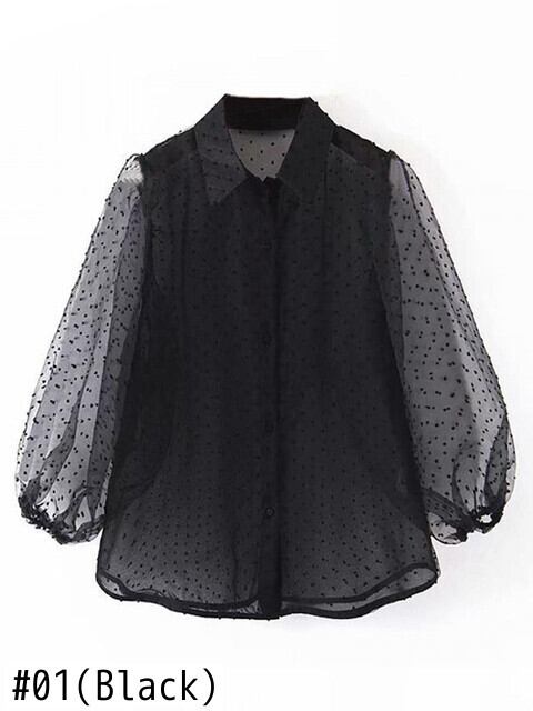 Aachoae ドット刺繍オーガンザ ブラウス Lantren スリーブ ブラック シースルー シックトップ ターン ダウン襟シャツ