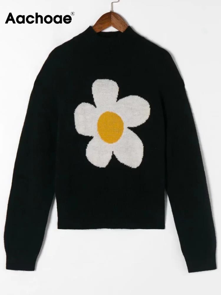 Aachoae レディース シックフローラルプリントセーター 長袖 タートルネック ジャンパー トップス セーター ロング 花柄