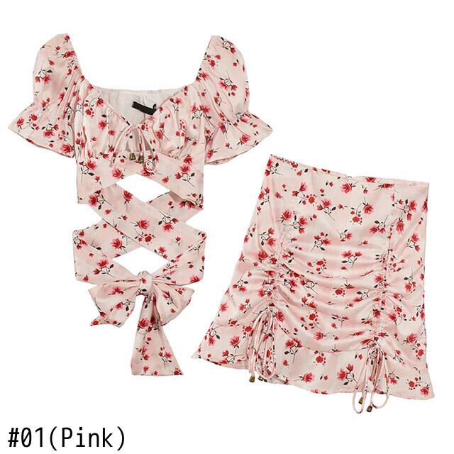 Aachoae ビーチパーティー 2 ピースセット甘いフローラプリントクロップドブラウスシャツウエストプリーツシース A ラインスカート 大人ガーリー スウィート キュート カジュアル Aライン | city&trip