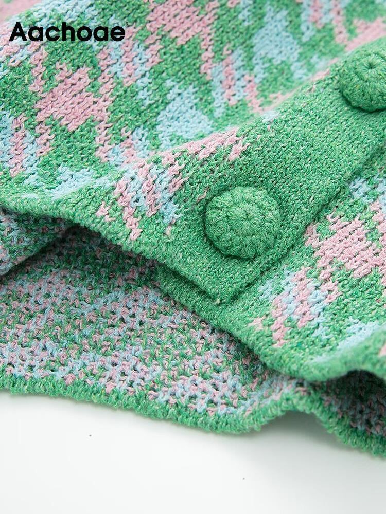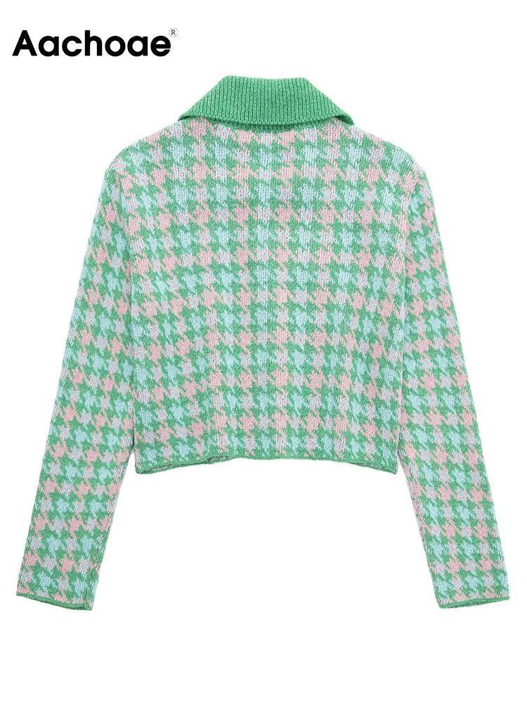 Aachoae 千鳥格子プリントクロップドカーディガンセーターターンダウン襟ボタンアップニットコートコート