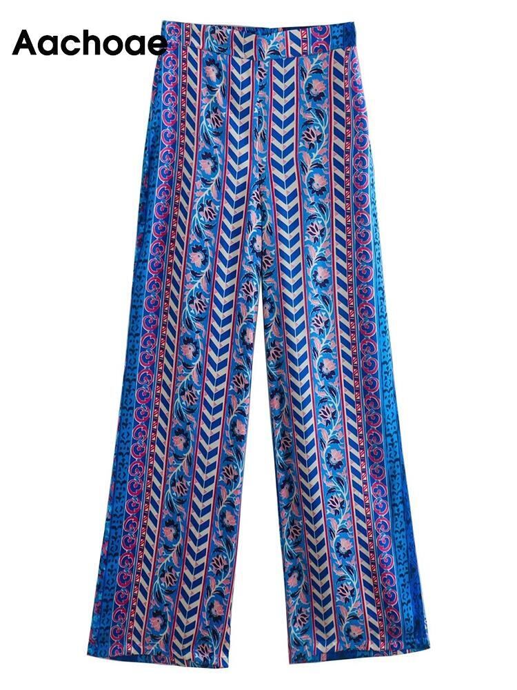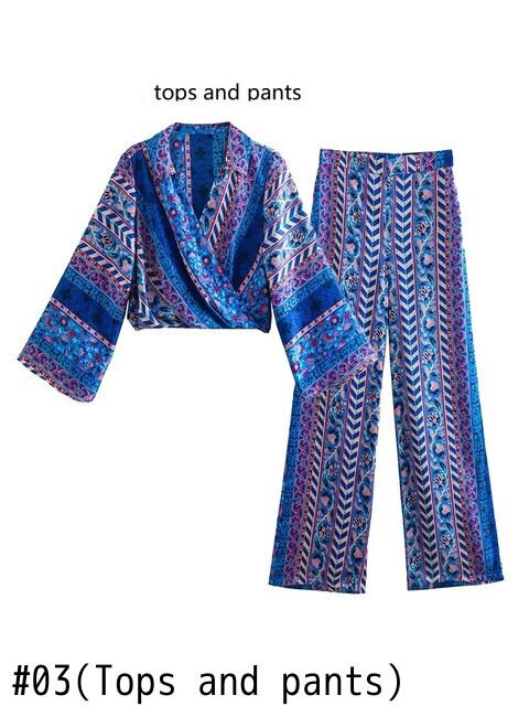 Aachoae 2 点セット花柄プリントターンダウン襟長袖クロップドトップスウエスト全身パンツ ロング