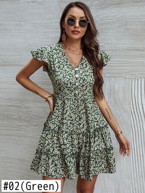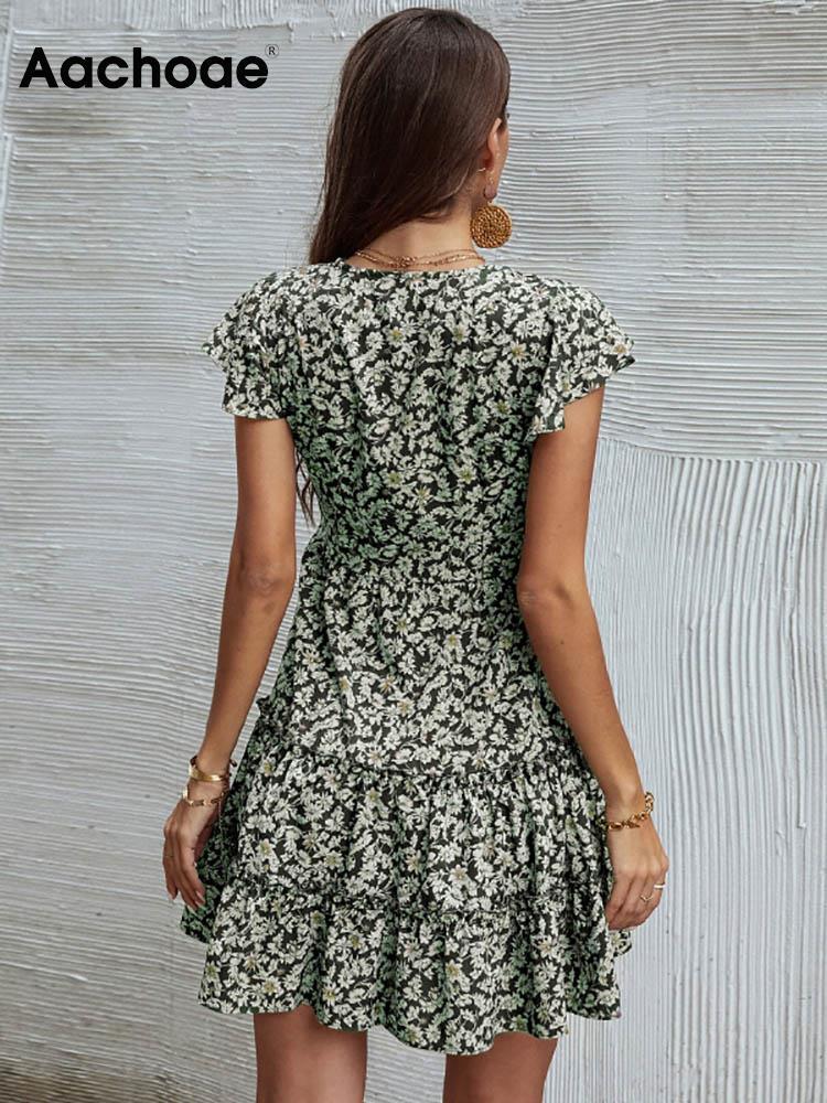 Aachoae 花柄サマードレス V ネックフリルビーチミニドレス A ライン半袖ボヘミアンホリデードレス ショート ハーフスリーブ ラッフル プリント 夏物 Vネック Aライン | city&trip
