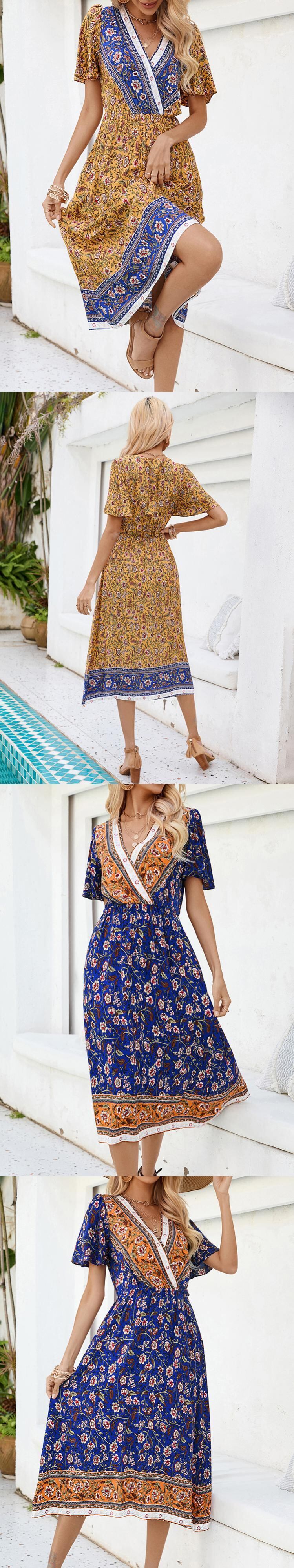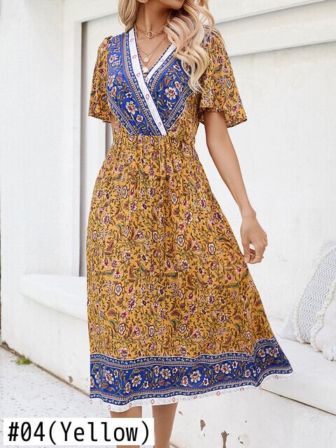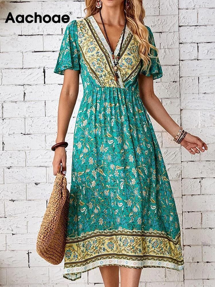 Aachoae 夏自由奔放生きるスタイル花柄ミディドレス V ネック半袖ドレス A ラインパーティードレス ショート ハーフスリーブ プリント サマー 夏物 Vネック Aライン | city&trip