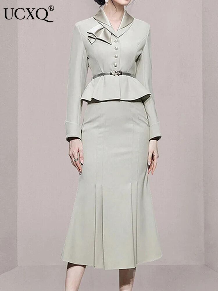 UCXQ e モードセット Europäischen Stil Unregelmäßigen V-ausschnitt ブレザー マンテル フィッシュシュヴァンツ ロック ツヴァイ シュテュック セット フラウエン 2024 Frühling herbst 9155 | city&trip