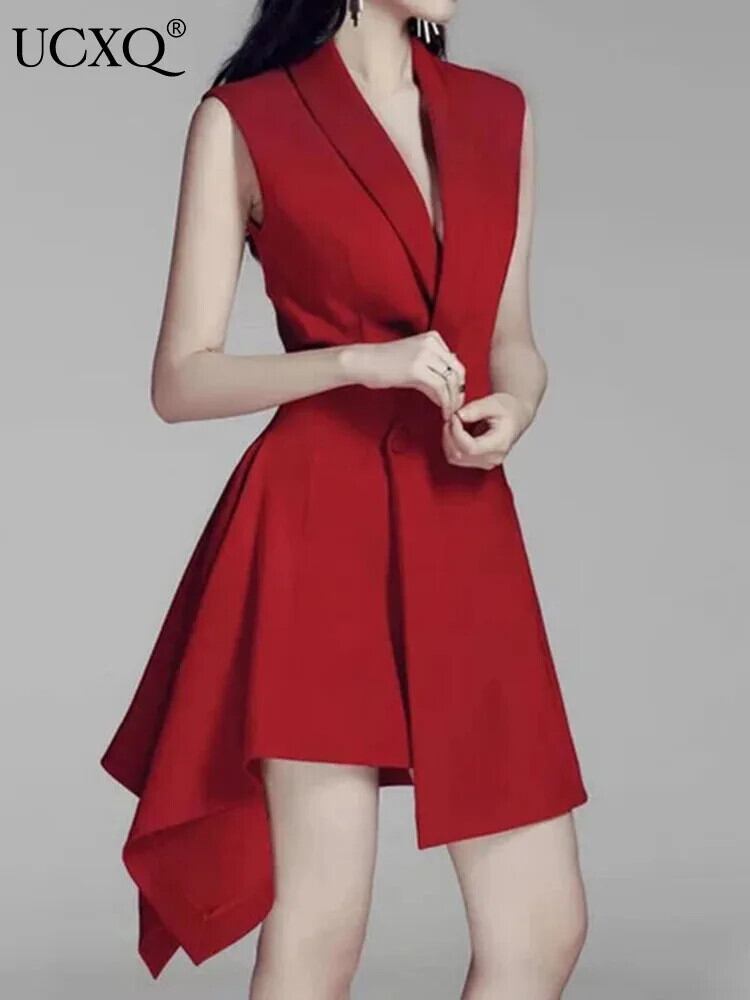 UCXQ e Feestjurk Europese Stijl Onregelmatige Zoom Riem TailleKantor Dame Korte Pak Jurken Vrouwen 2024 Lente Zomer 23A8931 | city&trip