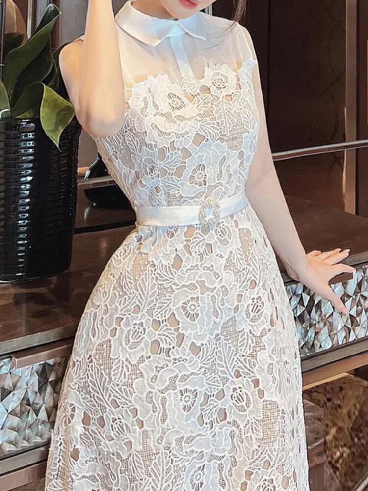 Ucxq モード Damen langes Kleid Fairycore Peter Pan Kragen Spleißen Spitze Taille ärmelloseエレガント Kleider 2024 Frühling Sommer 633 | city&trip