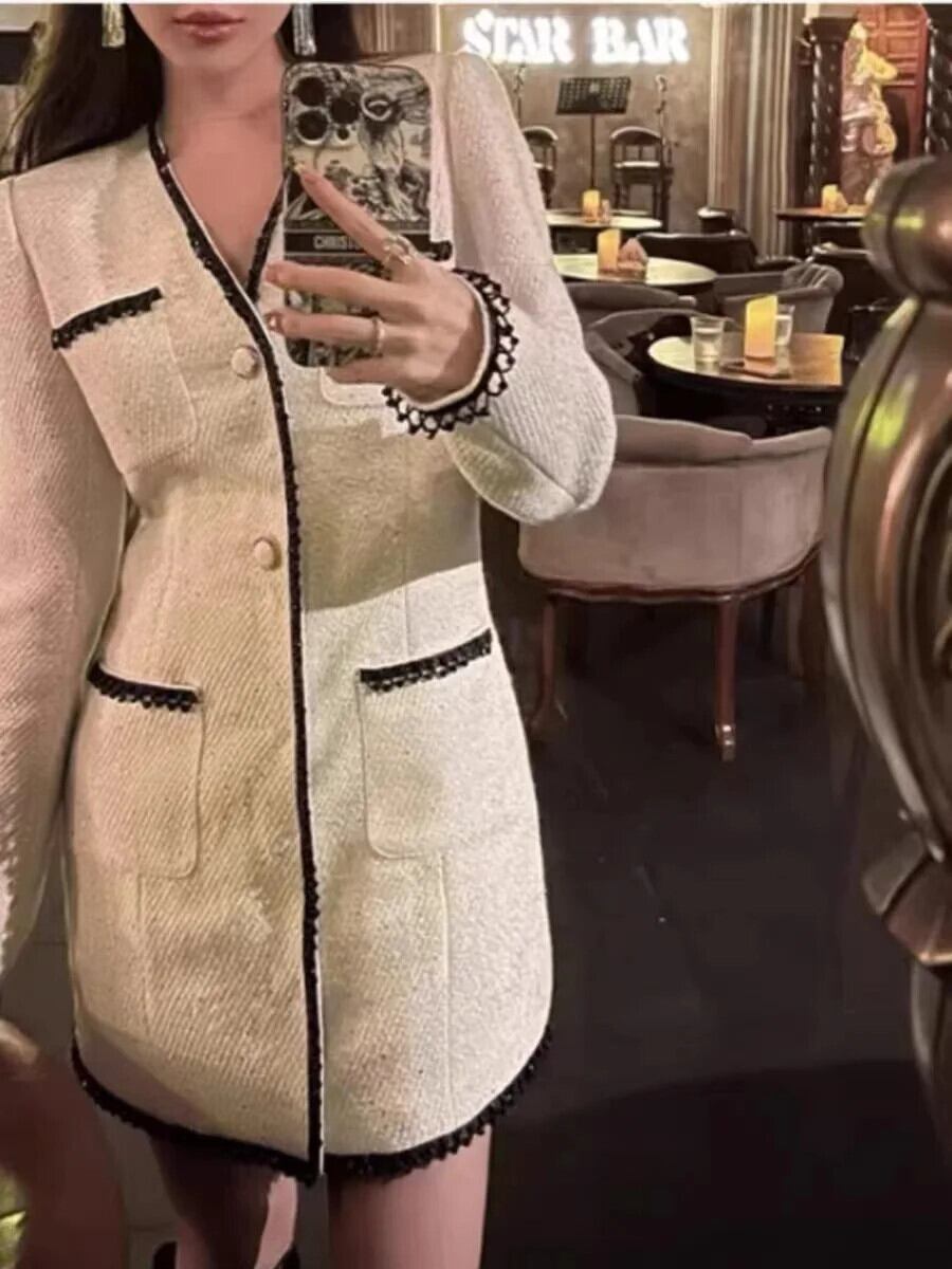 UCXQ モード Anzug Kleid ischen Stil V-ausschnitt Hohe Taille Langarm Strickjacke ツイード パーティー Kleider Frauen 2024 Frühling Herbst A9031 | city&trip