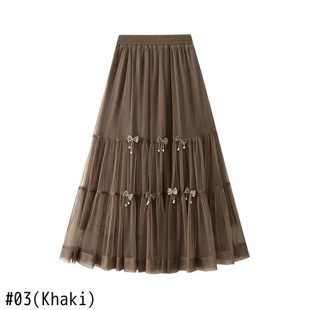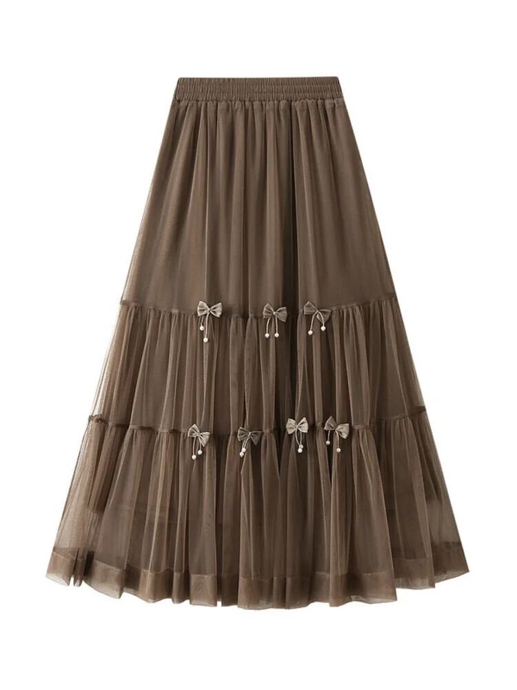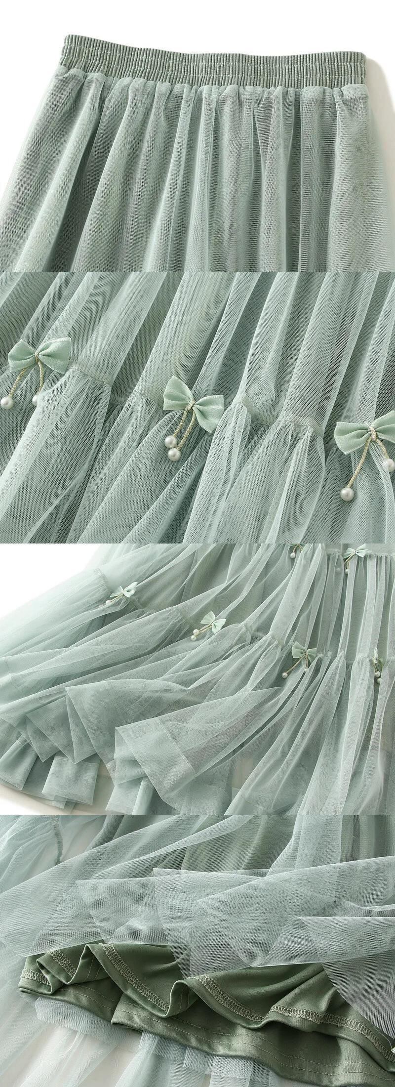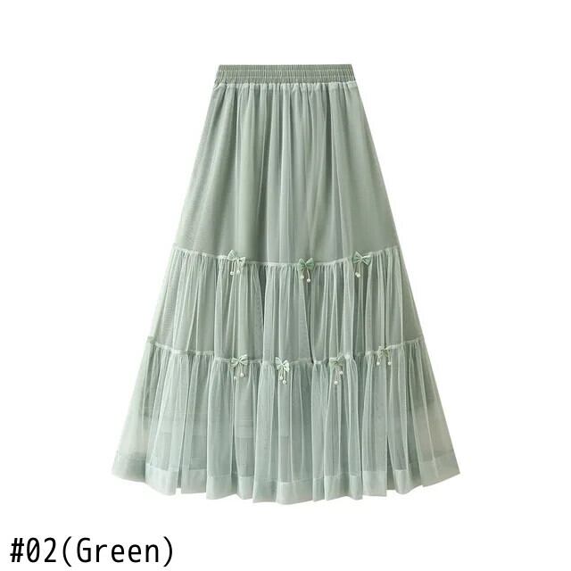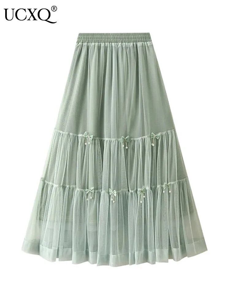 UCXQ Süßer Bogen-Mesh-Kuchenrock、エレガント、mehrfarbig、lässig、Allgleiches、große Schaukel、A-Linie、lange Röcke für Damen、2024、Frühling、Sommer 8203 メッシュ | city&trip