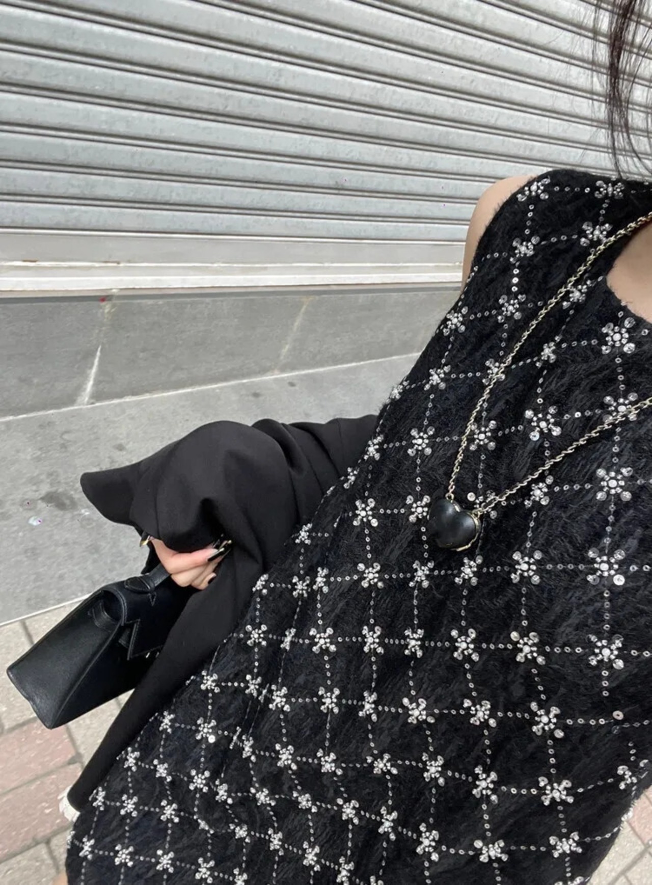 UCXQ ischer Stil mit Pailletten、ärmelloses A-Linien-Kleid、elegante Diamant-Blume、kurze Tank-Top-Kleider für Damen、2024、Frühling und Sommer、23A8239 エレガント | city&trip