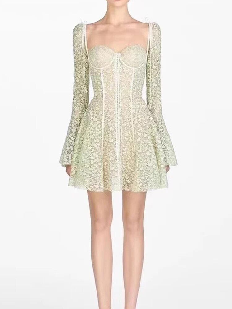 UCXQ Feen-Stil、Spitze、ausgehöhlt、trägerloses Kleid、elegante ausgestellte Ärmel、Band、kurze Kleider für Damen、2024、Neu、Frühling、Sommer 8187 エレガント | city&trip